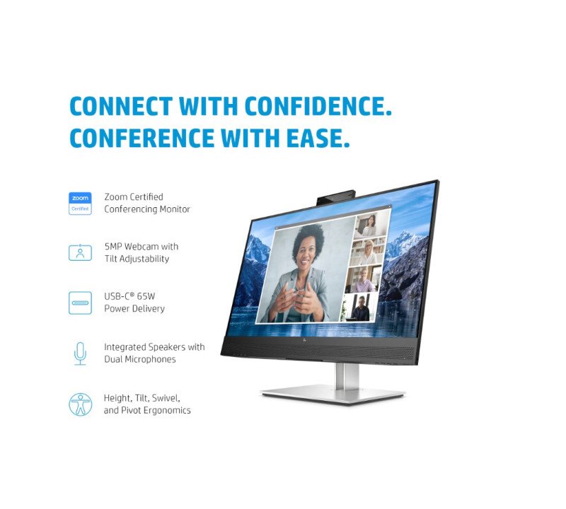 Conference and connect with ease with the Zoom Certified HP E27m G4 USB-C Conferencing Monitor that has an integrated 5MP, tilt-adjustable webcam, front-firing speakers, and dual mics. Work effortlessly and simplify your set up with one USB-C® cable[1] that delivers data, video, and up to 65W of laptop charging.
